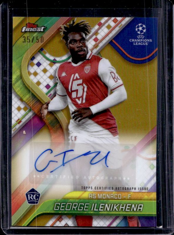 The George Ilenikhena 2024 Topps Finest UEFA Club Competitions #BA-GI Base Autographs - Gold Refractor /50 Rookie card is 1 of 68 George Ilenikhena's card variations in the 2024 Topps Finest UEFA Club Competitions set being tracked by Sports Card Investor, including Base, Refractor, Purple Refractor /299, Sky Blue Refractor /275, and Pink RayWave Refractor /250.