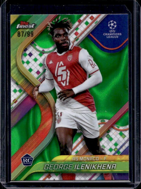 The George Ilenikhena 2024 Topps Finest UEFA Club Competitions #86 Green Lava Refractor /99 Rookie card is 1 of 68 George Ilenikhena's card variations in the 2024 Topps Finest UEFA Club Competitions set being tracked by Sports Card Investor, including Base, Refractor, Purple Refractor /299, Sky Blue Refractor /275, and Pink RayWave Refractor /250.