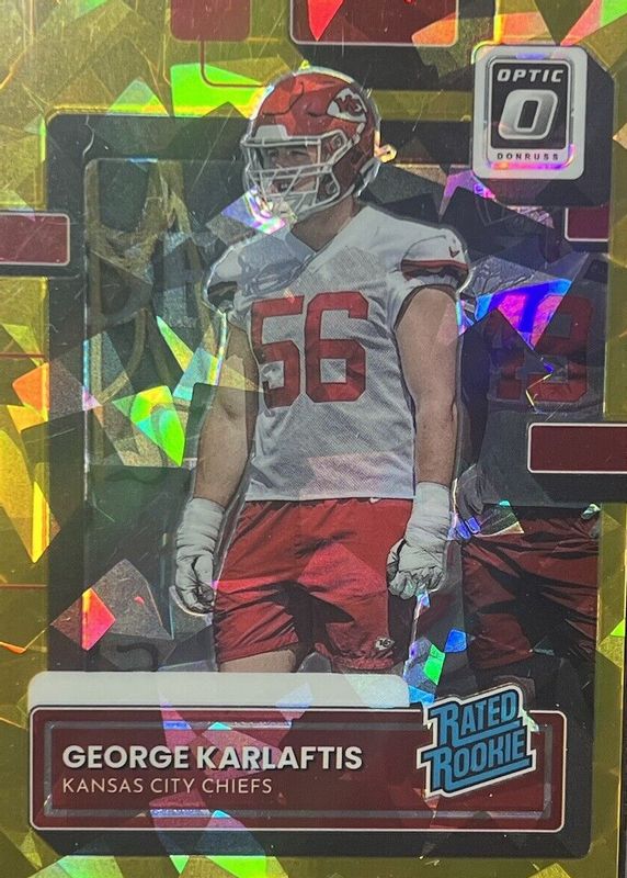 The George Karlaftis 2022 Donruss #P-361 Optic Preview - Gold Ice /10 Rookie card in Raw condition has not changed in price in the last 30 days and was last sold for $34.58 .