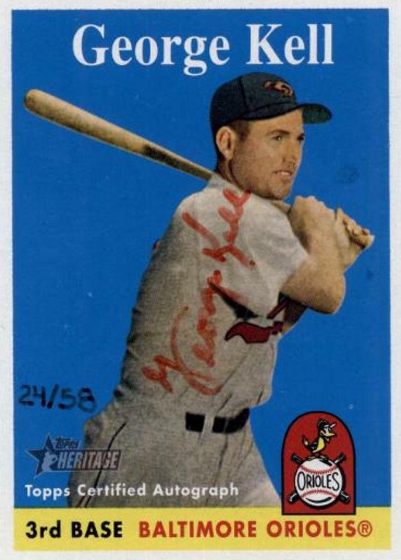 The George Kell 2007 Topps Heritage #ROA-GK Real One Autographs - Red Ink /58 card in Raw condition has not changed in price in the last 30 days and was last sold for $52.00 .
