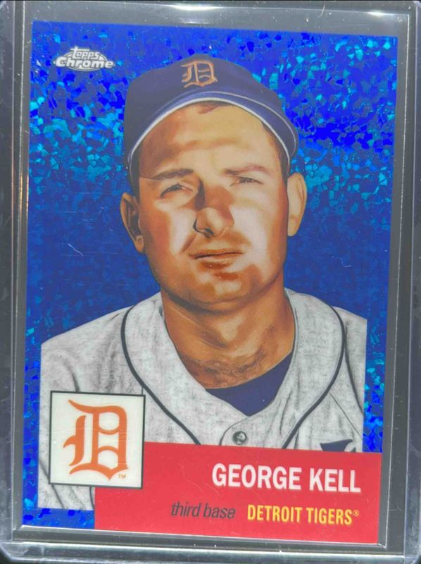 The George Kell 2022 Topps Chrome Platinum Anniversary #364 Blue Mini Diamond Refractor /199 card is 1 of 34 George Kell's card variations in the 2022 Topps Chrome Platinum Anniversary set being tracked by Sports Card Investor, including Base, Black & White Mini Diamond Refractor, Blue Prism Refractor, Gold Prism Refractor, and Prism Refractor.