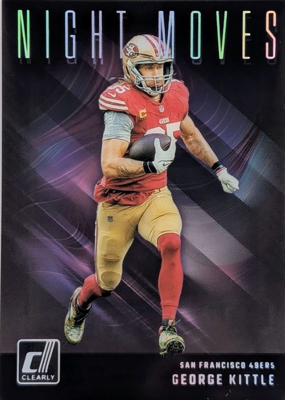 The George Kittle 2024 Clearly Donruss #15 Night Moves /(SSP) card in Raw condition has moved down -$2.00 (-3.6%) in the last 30 days and was last sold for $53.00 .
