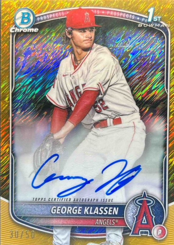 The George Klassen 2025 Bowman #CPA-GK Chrome Prospect Auto - Gold Shimmer Refractor /50 (1st) card in Raw condition has not changed in price in the last 30 days and was last sold for $56.69 .