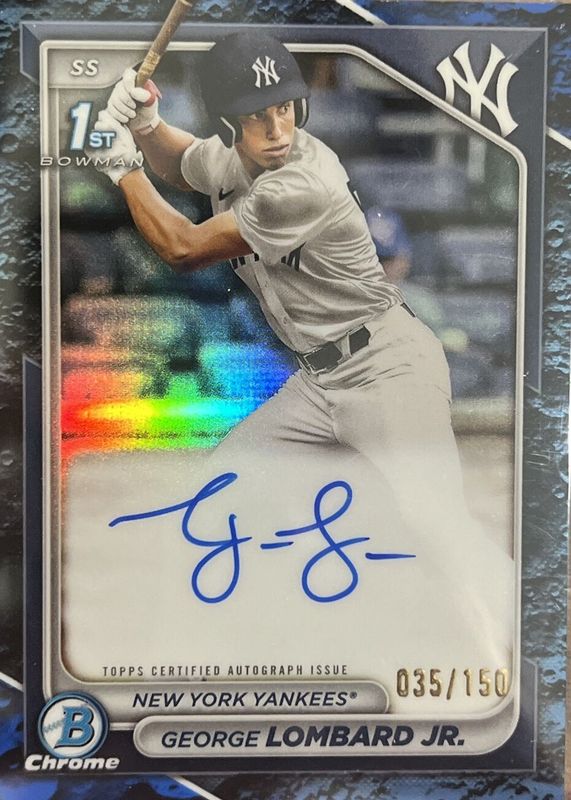 The George Lombard Jr. 2024 Bowman #CPA-GLO Chrome Prospect Auto - Blue Lunar Crater Refractor /150 (1st) card in Raw condition has not changed in price in the last 30 days and was last sold for $299.99 .
