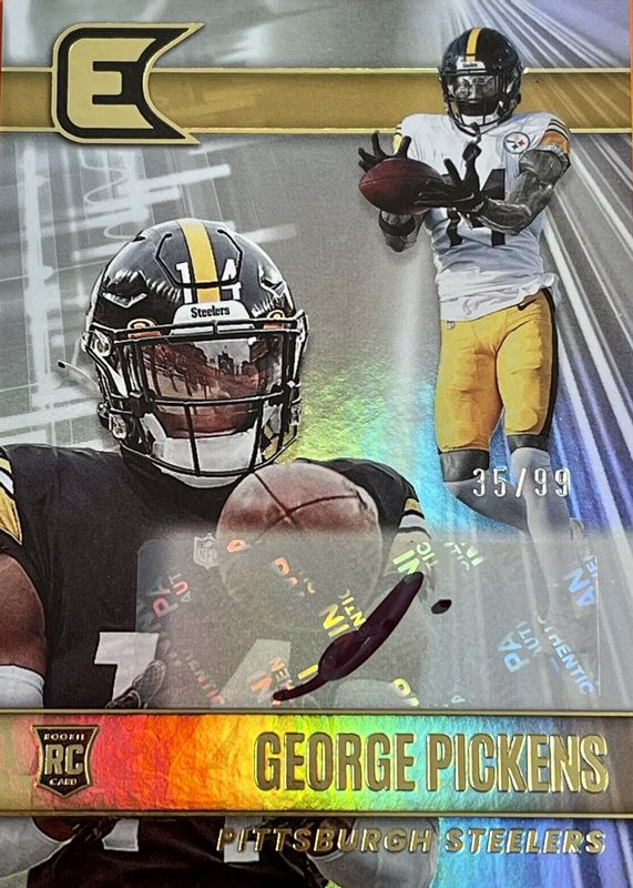 The George Pickens 2022 Chronicles #ESS-GEP Essentials Autographs (/99) Rookie card in Raw condition has not changed in price in the last 30 days and was last sold for $34.99 .
