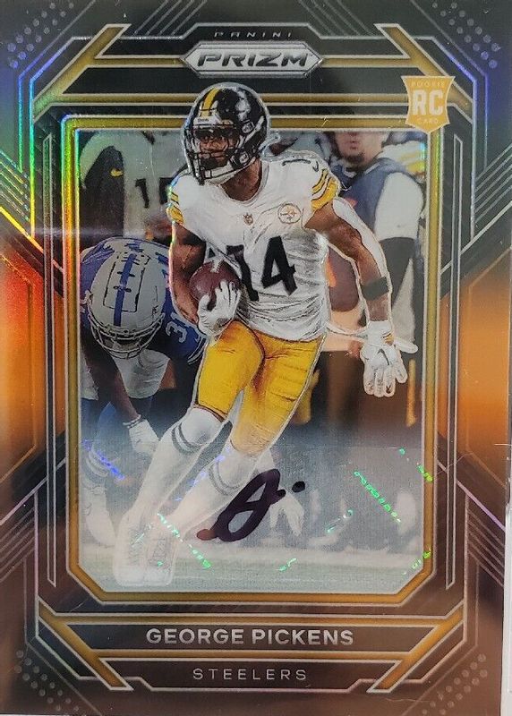 The George Pickens 2022 Chronicles #PB-20 Prizm Black Signatures - Orange (/35) Rookie card in Raw condition has not changed in price in the last 30 days and was last sold for $25.50 .