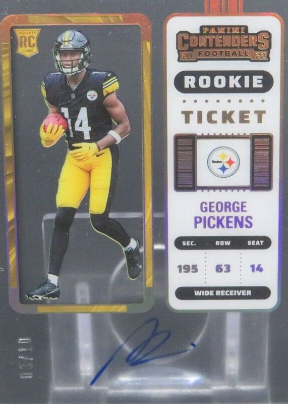 The George Pickens 2022 Contenders #118 Rookie Ticket Auto - Clear Ticket /10 card in Raw condition has not changed in price in the last 30 days and was last sold for $360.00 .