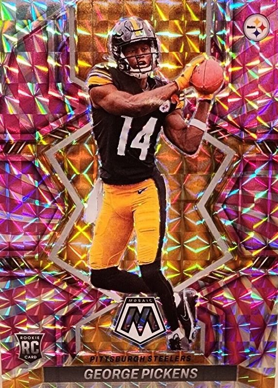 The George Pickens 2022 Mosaic #282 NFL Debut - Pink Swirl /11 Rookie card in Raw condition has not changed in price in the last 30 days and was last sold for $63.00 .