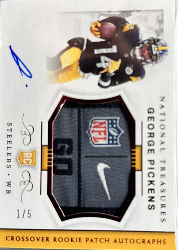 The George Pickens 2022 National Treasures #CRPA-GP Crossover Rookie Patch Autographs - Laundry Tag /5 card in Raw condition has not changed in price in the last 30 days and was last sold for $281.00 .