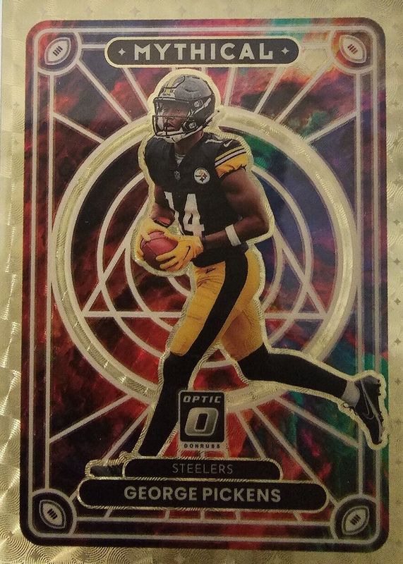 The George Pickens 2022 Optic #M-14 Mythical - Gold Vinyl /1 Rookie card in Raw condition has not changed in price in the last 30 days and was last sold for $699.99 .