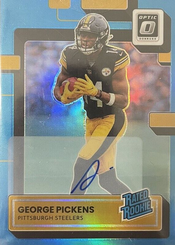 The George Pickens 2022 Optic #223 Rated Rookie Autographs - Blue /99 card in Raw condition has not changed in price in the last 30 days and was last sold for $49.99 .