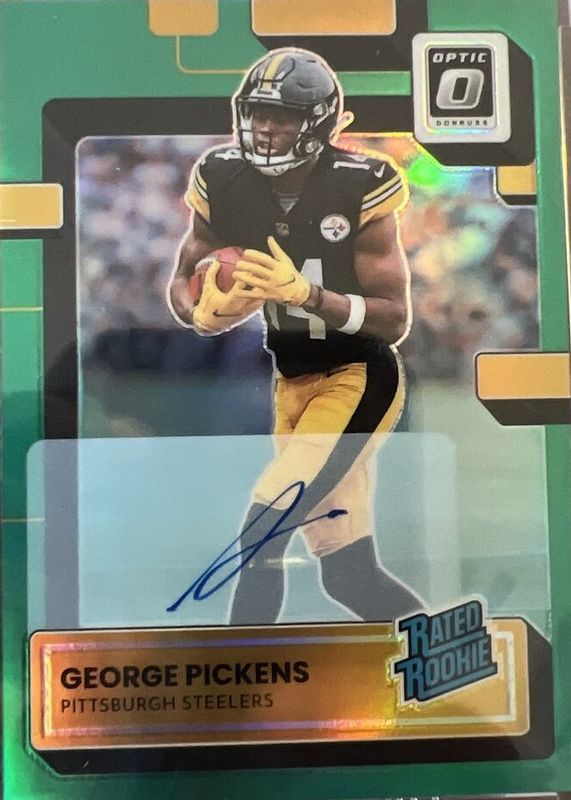 The George Pickens 2022 Optic #223 Rated Rookie Autographs - Green /5 card in Raw condition has not changed in price in the last 30 days and was last sold for $500.00 .