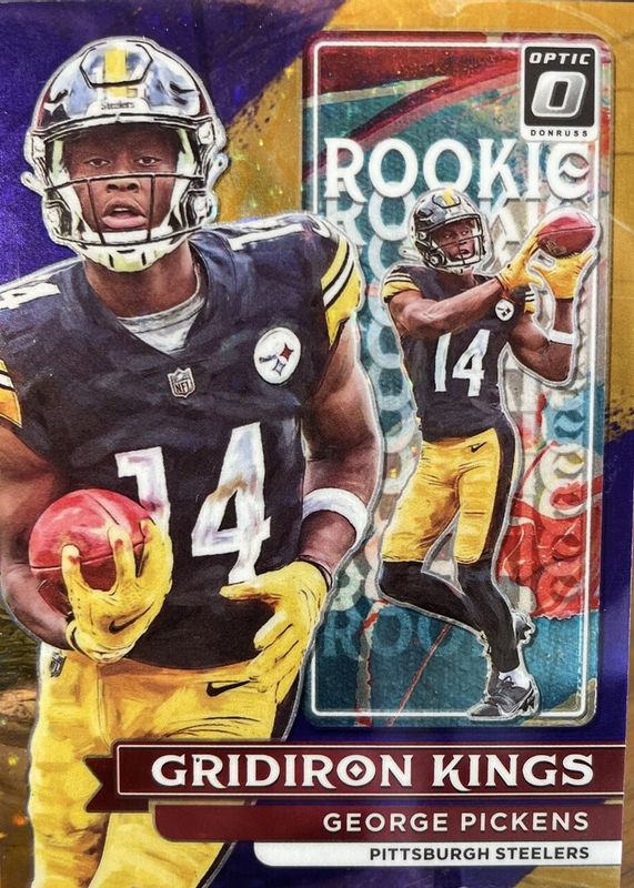 The George Pickens 2022 Optic #RGK-15 Rookie Gridiron Kings - Purple Stars /25 card in Raw condition has not changed in price in the last 30 days and was last sold for $27.99 .