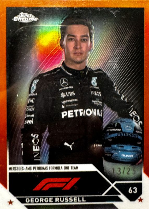 The George Russell 2023 Topps Chrome Formula 1 #13 Orange Refractor /25 card in Raw condition has not changed in price in the last 30 days and was last sold for $30.00 .