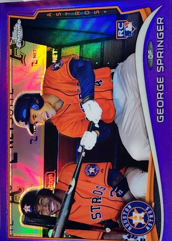 George Springer's Baseball cards are available in at least 129 sets. George Springer's biggest 7-day price movers are 2014 Topps Heritage High Number #H557 Base, 2014 Topps Update #US-210 Rookie Debut - Clear /10, and 2014 Topps Chrome #138 Purple Refractor.