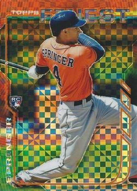 The George Springer 2014 Topps Finest #39 X Fractor Rookie card is 1 of 31 George Springer's card variations in the 2014 Topps Finest set being tracked by Sports Card Investor, including Base, Refractor, Orange Refractor, Green Refractor /199, and Blue Refractor /125.