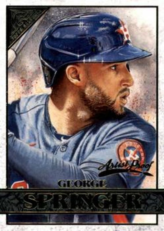 The George Springer 2020 Topps Gallery #62 Artist's Proofs card is 1 of 18 George Springer's card variations in the 2020 Topps Gallery set being tracked by Sports Card Investor, including Base, Rainbow Foil, Wood, Private Issue /250, and Green /99.