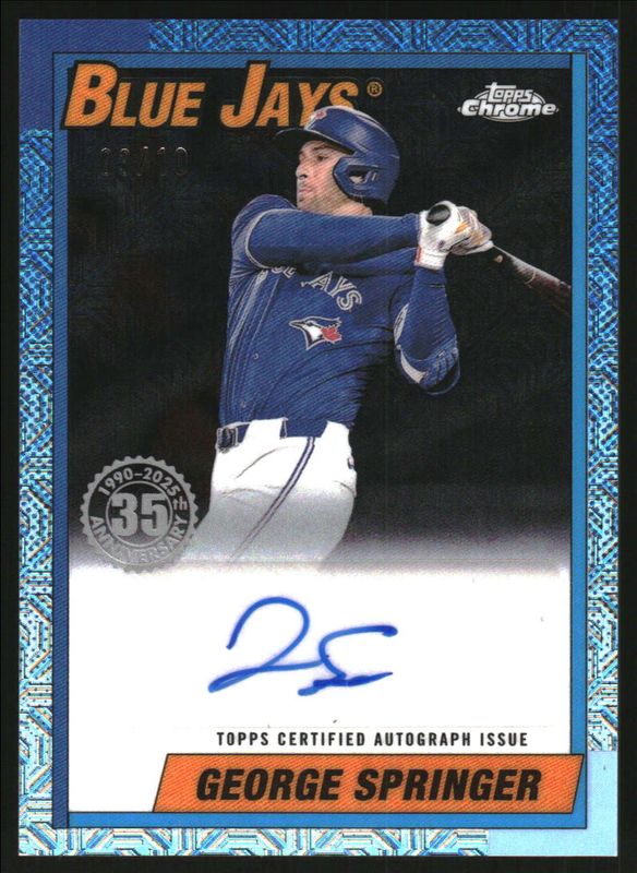 The George Springer 2025 Topps #90CA2-GS 1990 Baseball Chrome Silver Pack Autographs (Series 2) - Black Refractor /10 card is 1 of 136 George Springer's card variations in the 2025 Topps set being tracked by Sports Card Investor, including Base, Aqua Holo Foil, Diamante Foil, Holo Foil, and Pink Diamante Foil.