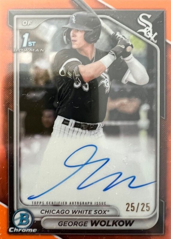 The George Wolkow 2024 Bowman #CPA-GWO Chrome Prospect Auto - Orange Refractor /25 (1st) card in Raw condition has not changed in price in the last 30 days and was last sold for $404.99 .