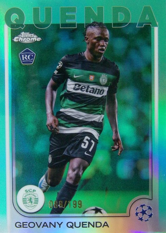 This card is 1 of 46 Geovany Quenda's card variations in the 2024 Topps Chrome UEFA Club Competitions set being tracked by Sports Card Investor, including Base, Geometric Refractor, Hongbao Red Refractor, Magenta Shimmer Refractor, and Pulsar Refractor.
