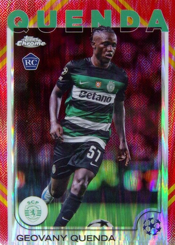 This card is 1 of 46 Geovany Quenda's card variations in the 2024 Topps Chrome UEFA Club Competitions set being tracked by Sports Card Investor, including Base, Geometric Refractor, Hongbao Red Refractor, Magenta Shimmer Refractor, and Pulsar Refractor.