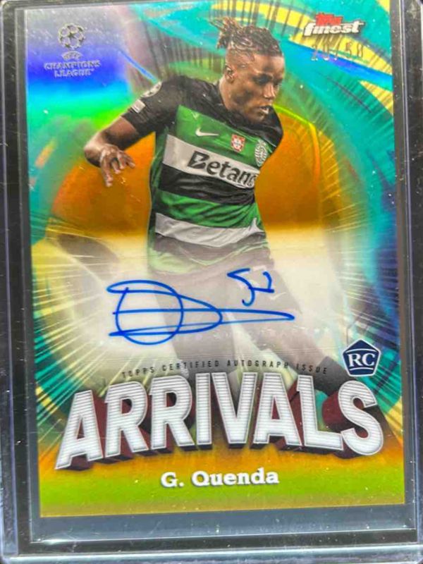 The Geovany Quenda 2024 Topps Finest UEFA Club Competitions #AA-GQ Arrivals Autographs - Gold Refractor /50 Rookie card is 1 of 68 Geovany Quenda's card variations in the 2024 Topps Finest UEFA Club Competitions set being tracked by Sports Card Investor, including Base, Refractor, Purple Refractor /299, Sky Blue Refractor /275, and Pink RayWave Refractor /250.