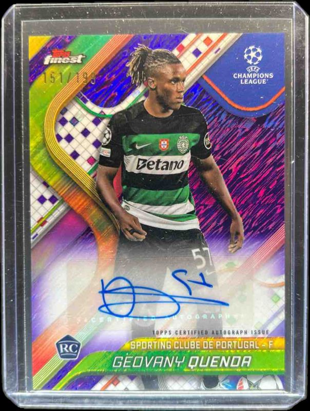 The Geovany Quenda 2024 Topps Finest UEFA Club Competitions #BA-GQ Base Autographs - Purple Shimmer Refractor /199 Rookie card is 1 of 68 Geovany Quenda's card variations in the 2024 Topps Finest UEFA Club Competitions set being tracked by Sports Card Investor, including Base, Refractor, Purple Refractor /299, Sky Blue Refractor /275, and Pink RayWave Refractor /250.