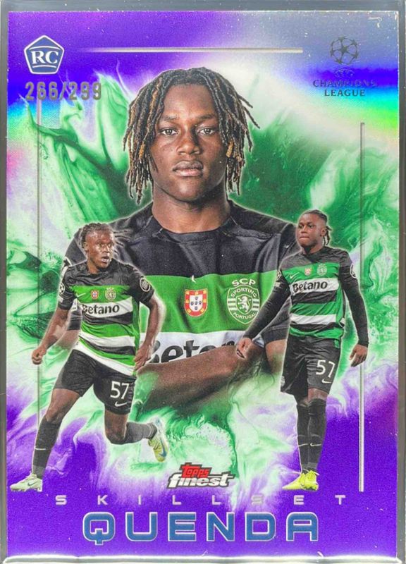The Geovany Quenda 2024 Topps Finest UEFA Club Competitions #SK-6 Finest Skillset - Purple Refractor /299 Rookie card is 1 of 68 Geovany Quenda's card variations in the 2024 Topps Finest UEFA Club Competitions set being tracked by Sports Card Investor, including Base, Refractor, Purple Refractor /299, Sky Blue Refractor /275, and Pink RayWave Refractor /250.