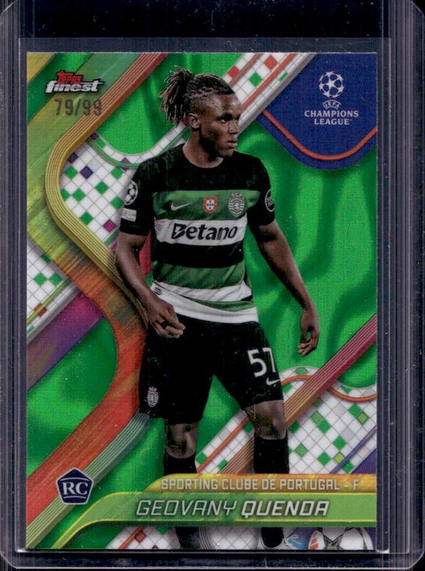 The Geovany Quenda 2024 Topps Finest UEFA Club Competitions #116 Green Lava Refractor /99 Rookie card is 1 of 68 Geovany Quenda's card variations in the 2024 Topps Finest UEFA Club Competitions set being tracked by Sports Card Investor, including Base, Refractor, Purple Refractor /299, Sky Blue Refractor /275, and Pink RayWave Refractor /250.