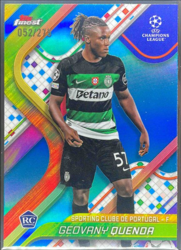 The Geovany Quenda 2024 Topps Finest UEFA Club Competitions #116 Sky Blue Refractor /275 Rookie card is 1 of 68 Geovany Quenda's card variations in the 2024 Topps Finest UEFA Club Competitions set being tracked by Sports Card Investor, including Base, Refractor, Purple Refractor /299, Pink RayWave Refractor /250, and Purple Lava Refractor /199.