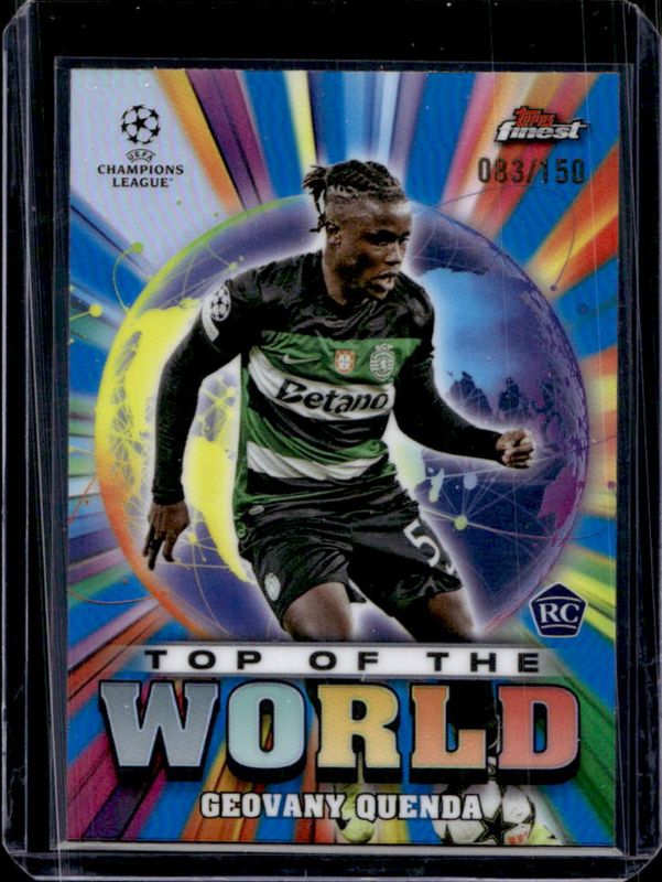 The Geovany Quenda 2024 Topps Finest UEFA Club Competitions #TW-25 Top of the World - Blue Refractor /150 Rookie card is 1 of 68 Geovany Quenda's card variations in the 2024 Topps Finest UEFA Club Competitions set being tracked by Sports Card Investor, including Base, Refractor, Purple Refractor /299, Sky Blue Refractor /275, and Pink RayWave Refractor /250.