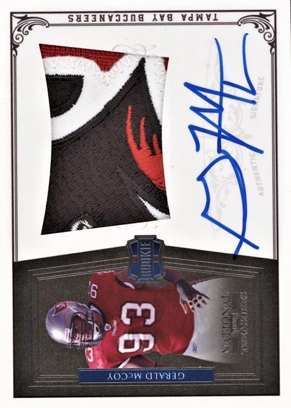 This card is 1 of 3 Gerald McCoy's card variations in the 2010 National Treasures set being tracked by Sports Card Investor, including Rookie Patch Auto - Gold /25, and Rookie Patch Auto - Platinum /5.