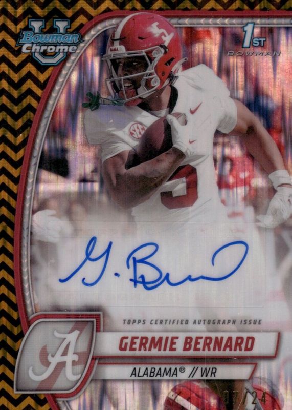 This card is 1 of 14 Germie Bernard's card variations in the 2024 Bowman Chrome University set being tracked by Sports Card Investor, including Prospect Auto (1st), Prospect Auto - Stealth Refractor (1st), Prospect Auto - Refractor /299 (1st), Prospect Auto - Fuchsia Refractor /150 (1st), and Prospect Auto - Green Refractor /99 (1st).