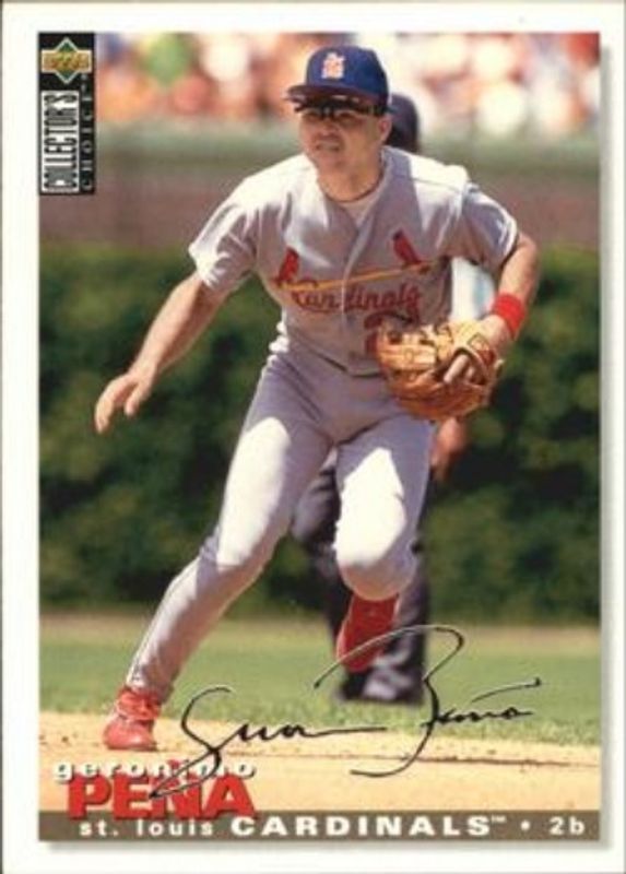 The Geronimo Pena 1995 Upper Deck Collector's Choice #186 Silver Signatures card is 1 of 3 Geronimo Pena's card variations in the 1995 Upper Deck Collector's Choice set being tracked by Sports Card Investor, including Base, and Gold Signatures.