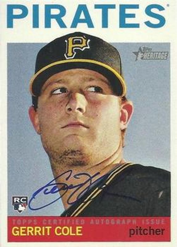 The Gerrit Cole 2013 Topps Heritage #ROA-GC Real One Autographs Rookie card is 1 of 2 Gerrit Cole's card variations in the 2013 Topps Heritage set being tracked by Sports Card Investor, including Base.