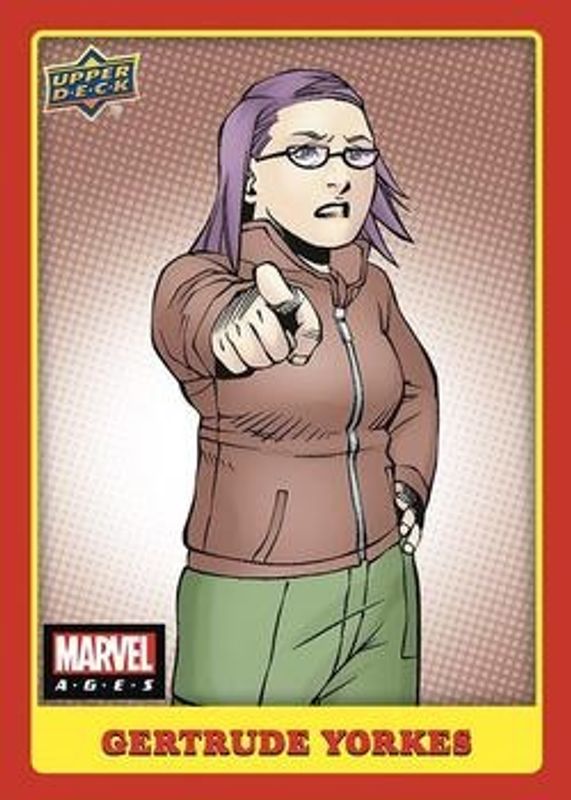 The Gertrude Yorkes 2020 Upper Deck Marvel Ages #62 Base card is 1 of 3 Gertrude Yorkes' card variations in the 2020 Upper Deck Marvel Ages set being tracked by Sports Card Investor, including Color Wheel, and Low Series Stickers.