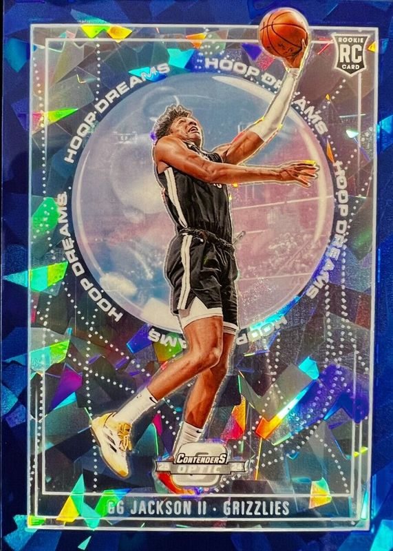 The GG Jackson II 2023 Contenders Optic #13 Hoop Dreams - Blue Cracked Ice /75 Rookie card in Raw condition has not changed in price in the last 30 days and was last sold for $2.50 .