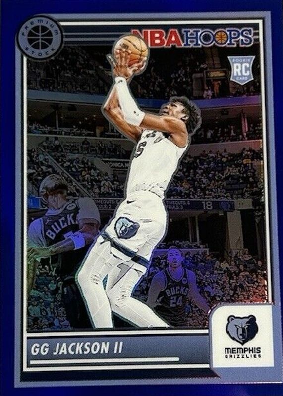 The GG Jackson II 2023 Hoops Premium Stock #43 Blue /120 Rookie card in Raw condition has not changed in price in the last 30 days and was last sold for $0.99 .