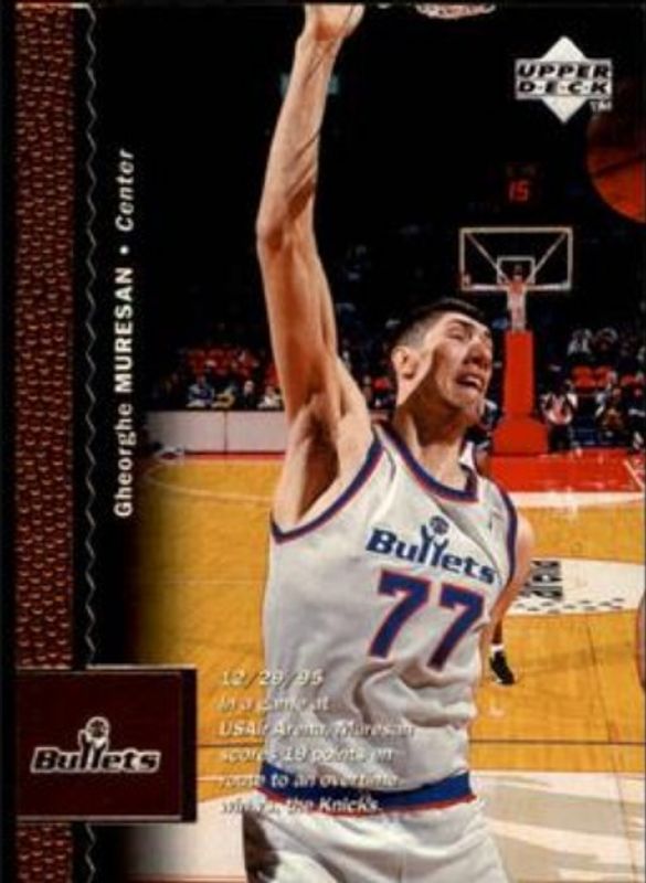 The Gheorghe Muresan 1996 Upper Deck #134 Base card is 1 of 6 Gheorghe Muresan's card variations in the 1996 Upper Deck set being tracked by Sports Card Investor, including #359 Base, #134 Gold Facsimile /1000, #359 Gold Facsimile /1000, #G20 Generation Excitement, and #G20 Generation Excitement Uncut Sheet Singles.