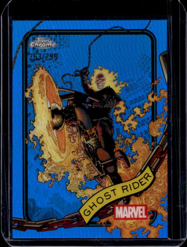 The Ghost Rider 2025 Topps Chrome #183 Blue Refractor /299 card is 1 of 43 Ghost Rider's card variations in the 2025 Topps Chrome set being tracked by Sports Card Investor, including Base, Refractor, Yellow Lava Refractor, Spider Web Refractor /399, and Blue & Green Shimmer Refractor /199.