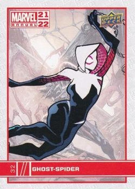 The Ghost-Spider 2021 Upper Deck Marvel Annual #32 Base card is 1 of 12 Ghost-Spider's card variations in the 2021 Upper Deck Marvel Annual set being tracked by Sports Card Investor, including Canvas Variant, Green, Magenta, Red, and Silver Sparkle.