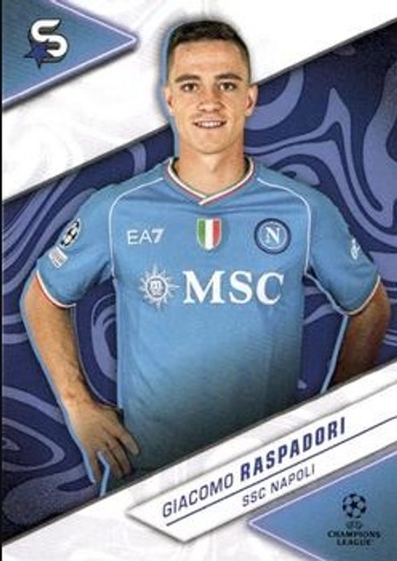 Giacomo Raspadori's Soccer cards are available in at least 43 sets. Giacomo Raspadori's biggest 7-day price movers are 2023 Topps UEFA Club Competitions Superstars #162 Base, 2023 Topps UEFA Club Competitions Superstars #162 Classic Pink Chrome /20, and 2023 Topps UEFA Club Competitions Superstars #162 Super Rare Mint /199.