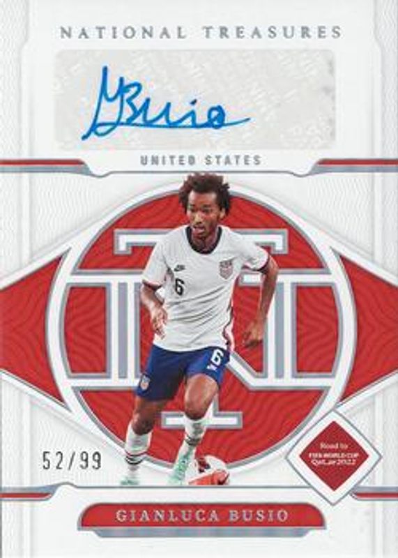 The Gianluca Busio 2022 National Treasures World Cup #S-GBU Signatures /99 card is 1 of 36 Gianluca Busio's card variations in the 2022 National Treasures World Cup set being tracked by Sports Card Investor, including Definitive Ink /99, Peerless Signatures /99, Penmanship /99, Peerless Signatures - Sapphire /49, and Signatures - Sapphire /49.