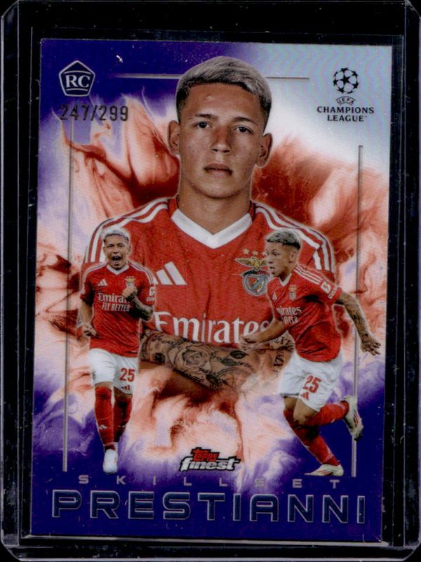 The Gianluca Prestianni 2024 Topps Finest UEFA Club Competitions #SK-14 Finest Skillset - Purple Refractor /299 card is 1 of 85 Gianluca Prestianni's card variations in the 2024 Topps Finest UEFA Club Competitions set being tracked by Sports Card Investor, including Base, Refractor, Purple Refractor /299, Sky Blue Refractor /275, and Pink RayWave Refractor /250.