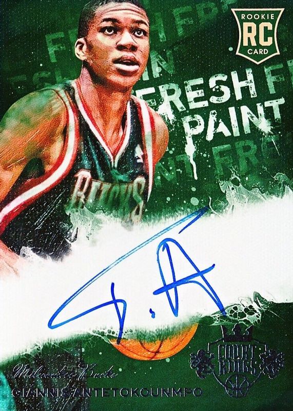 The Giannis Antetokounmpo 2013 Court Kings #28 Fresh Paint Autographs (/499) Rookie card in Raw condition has moved down -$74.00 (-14.5%) in the last 30 days and was last sold for $436.00 .