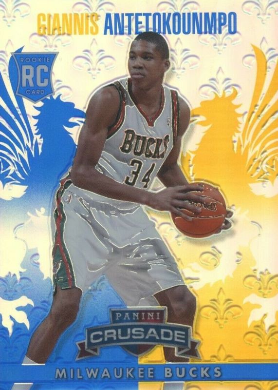 The Giannis Antetokounmpo 2013 Crusade #61 Crusade Blue Rookie card in Raw condition has not changed in price in the last 30 days and was last sold for $86.00 .