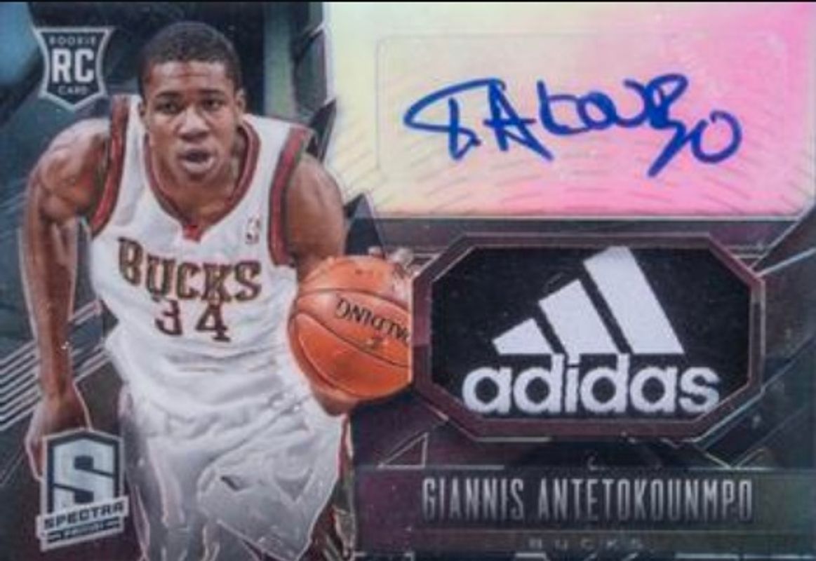 The Giannis Antetokounmpo 2013 Spectra #120 Black /1 Rookie card is 1 of 11 Giannis Antetokounmpo's card variations in the 2013 Spectra set being tracked by Sports Card Investor, including Base /199, Gold /10, Rookie Jersey Autographs, Rookie Jersey Autographs - Light Blue (/99), and Rookie Jersey Autographs - Orange (/60).