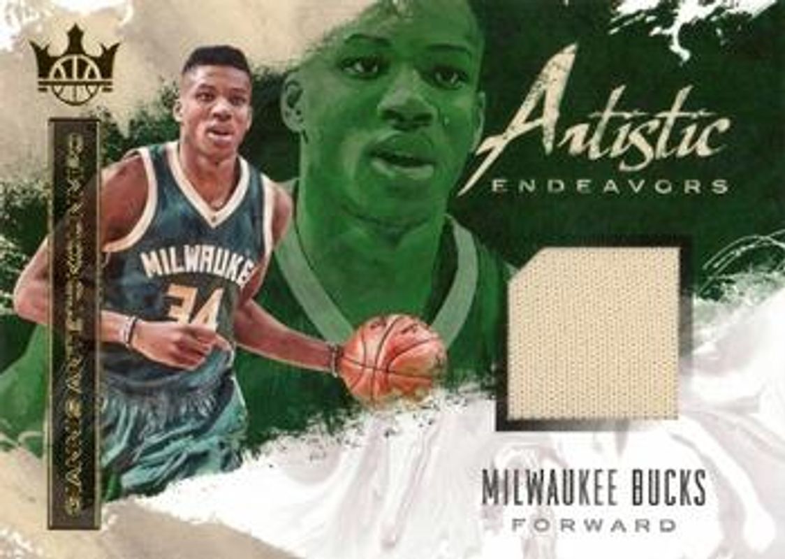 The Giannis Antetokounmpo 2017 Court Kings #AE-GA Artistic Endeavors /299 card is 1 of 16 Giannis Antetokounmpo's card variations in the 2017 Court Kings set being tracked by Sports Card Investor, including Base, Sapphire /25, Masterpiece /1, Box Topper Panoramics, and Points in the Paint.