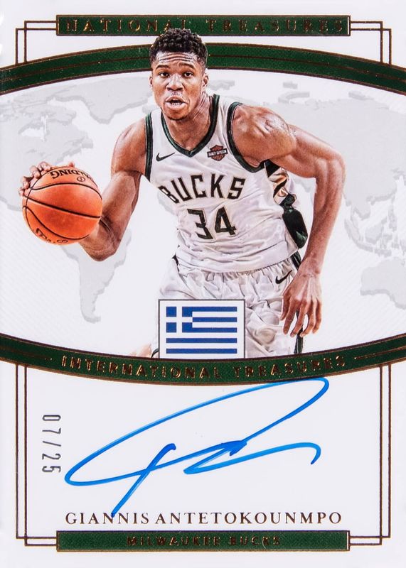 This card is 1 of 5 Giannis Antetokounmpo's card variations in the 2018 National Treasures set being tracked by Sports Card Investor, including International Treasures Autographs (/49), International Treasures Autographs - Gold /10, International Treasures Autographs - Emerald /5, and International Treasures Autographs - Platinum /1.