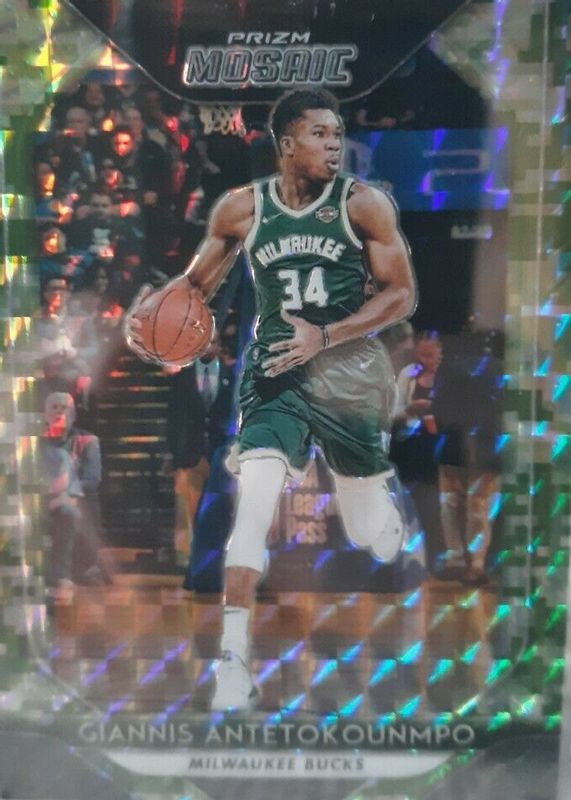 The Giannis Antetokounmpo 2018 Prizm Mosaic #30 Camo /25 card in Raw condition has not changed in price in the last 30 days and was last sold for $85.00 .